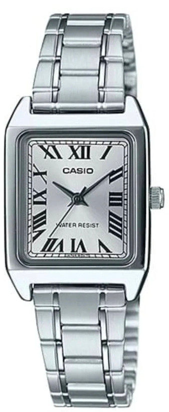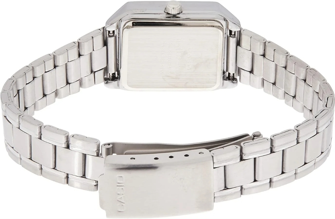 در مدل LTP-V007D-1B، کاسیو از یک رنگبندی کلاسیک، ساده و بسیار هماهنگ استفاده کرده است. قاب و بند از استیل ضدزنگ به رنگ نقرهای ساخته شدهاند که جلوهای مرتب، رسمی و بادوام به ساعت میدهد. بند استیل بهصورت یکپارچه طراحی شده و با قفل ایمن روی مچ قرار میگیرد، طوری که هم احساس راحتی دارد و هم از ثبات لازم برخوردار است.