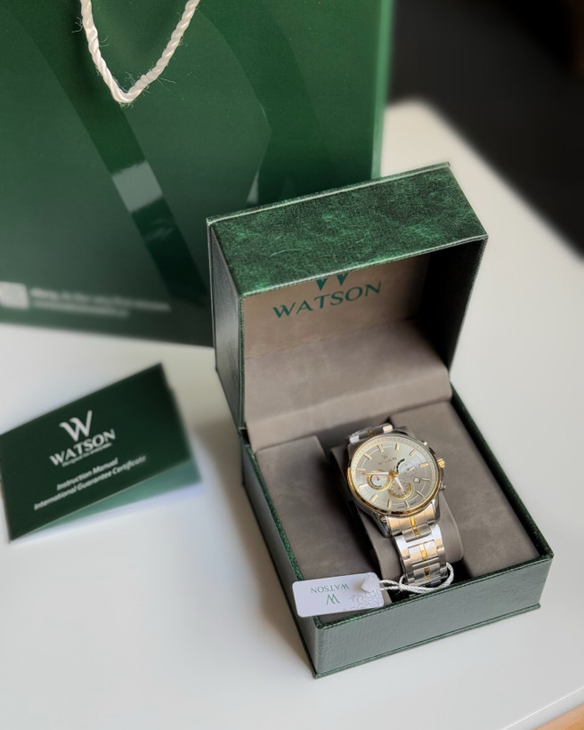 ساعت مردونه او رجینال واتسون کرنوگراف سیلور طلایی فول العاده خاص اسپرت روزانه رسمی کلاسیک کرنوگراف موتور ژاپن استیل ضد آب قطر صفحه ساعت ۴۴ میلیمتر شیشه: مینرال تاریخدار شبنما دوسال گا رانتی همراه جعبه، بگ و کارت گارانتی ضداب صد درصد قفل پروانهای با کیفیت
