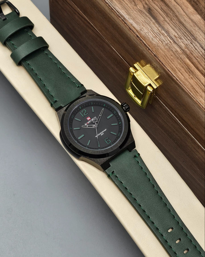 ساعت مردانه ناویفورس مدل مردانه از برند اکونومی ناویفورس با سایز قاب متری واسه اون عزیزانی که ساعت کلاسیک قاب ریز دوست دارن با رنگ سبز ساعت ناویفورس NAVIFORCE کد رفرانس NF0233 اورجینال موومنت ژاپنی قاب استیل ضد حساسیت بند چرم موجود در سه رنگ قفل کمربندی دارای پک اورجینال و شناسنامه ضمانت 12 ماهه شرکتی ضدآبی عالی و موتور ژاپن اصلی