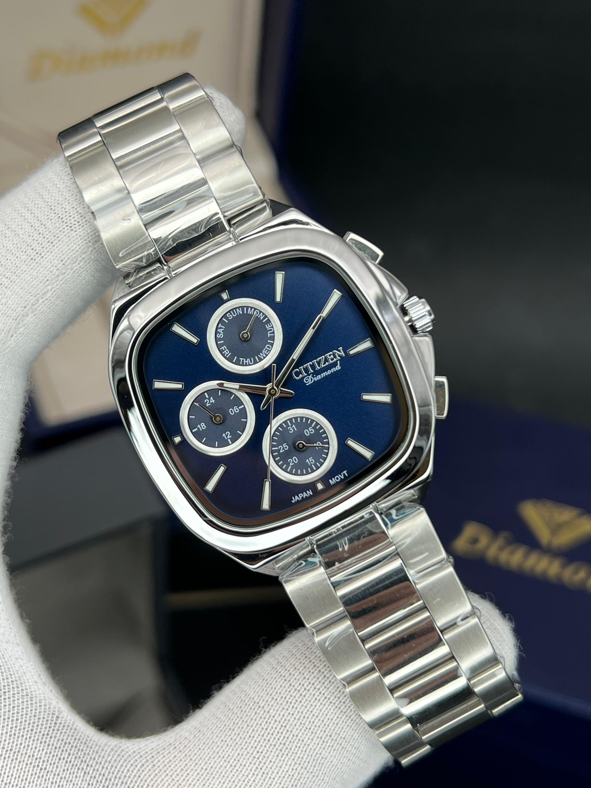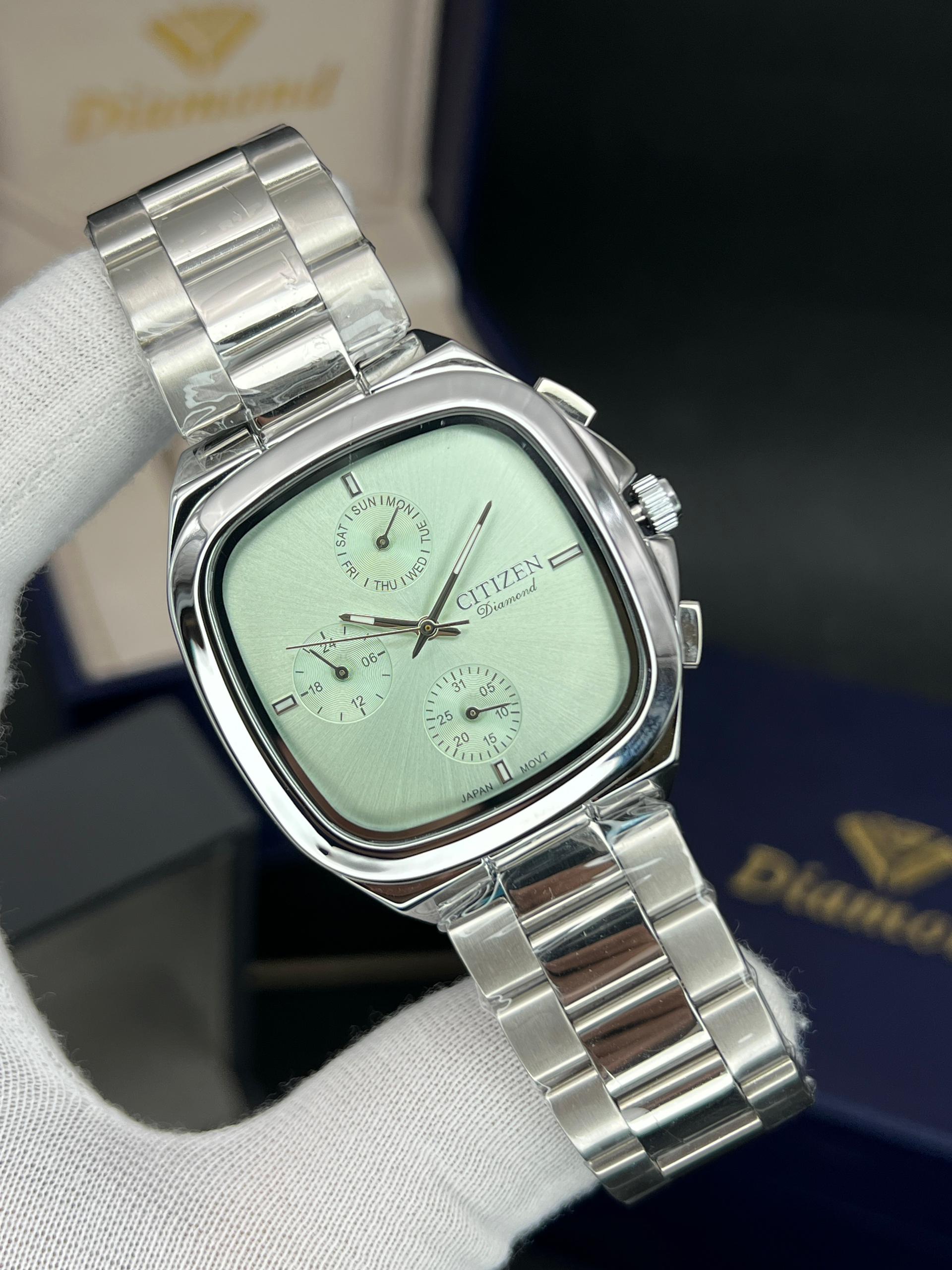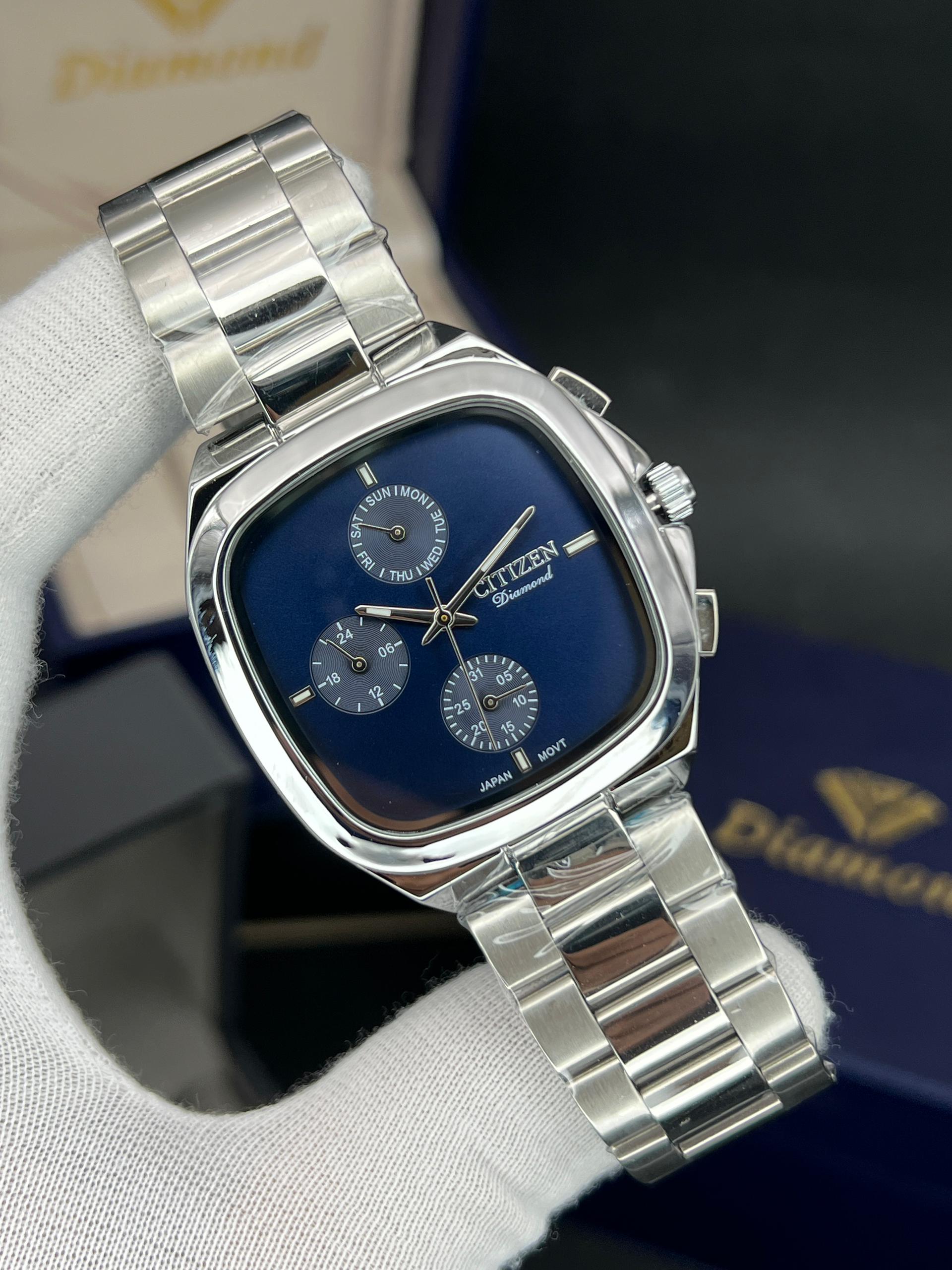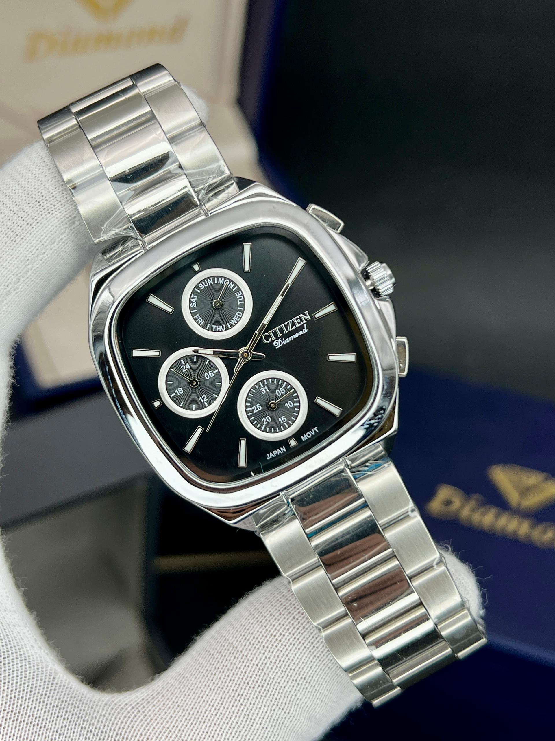 رومانسون مردانه سه موتوره فعال چهارگوش مدل خاص و پرفروش تنوع رنگ قاب و رنگ صفحه موتور ژاپن با گارانتی یکساله موتور ضد اب در حد دست شستن دارای تقویم روز وایام هفته