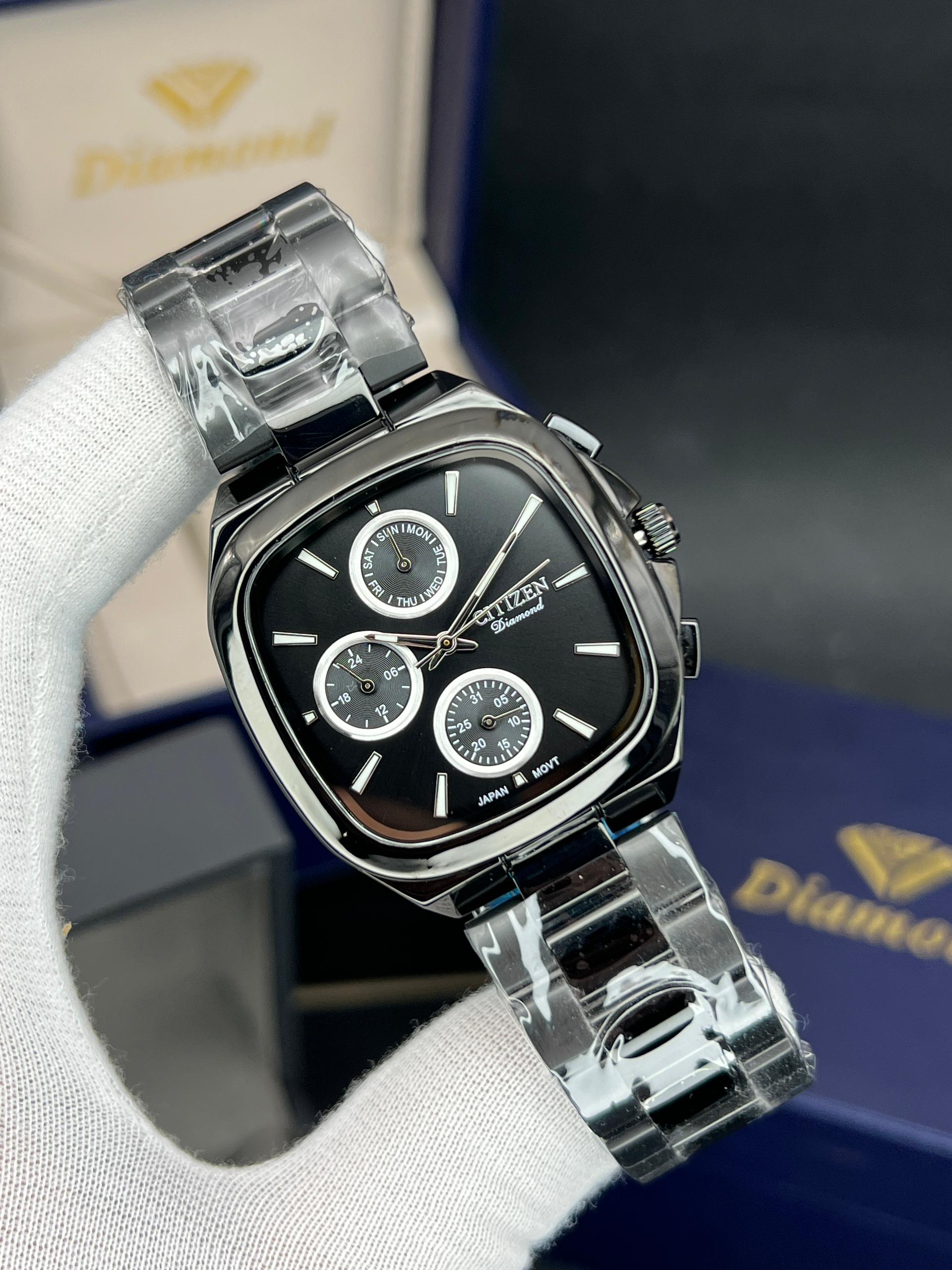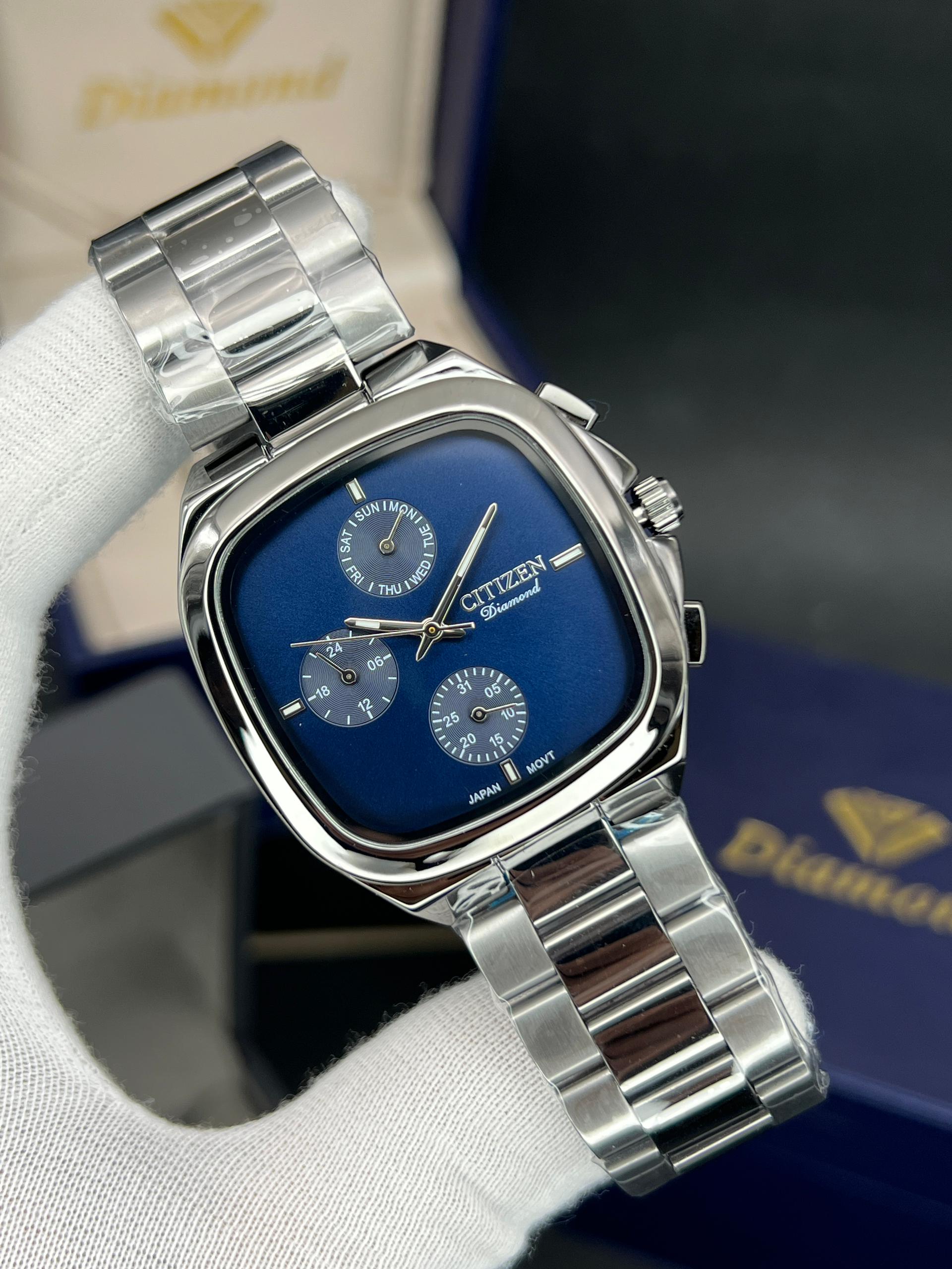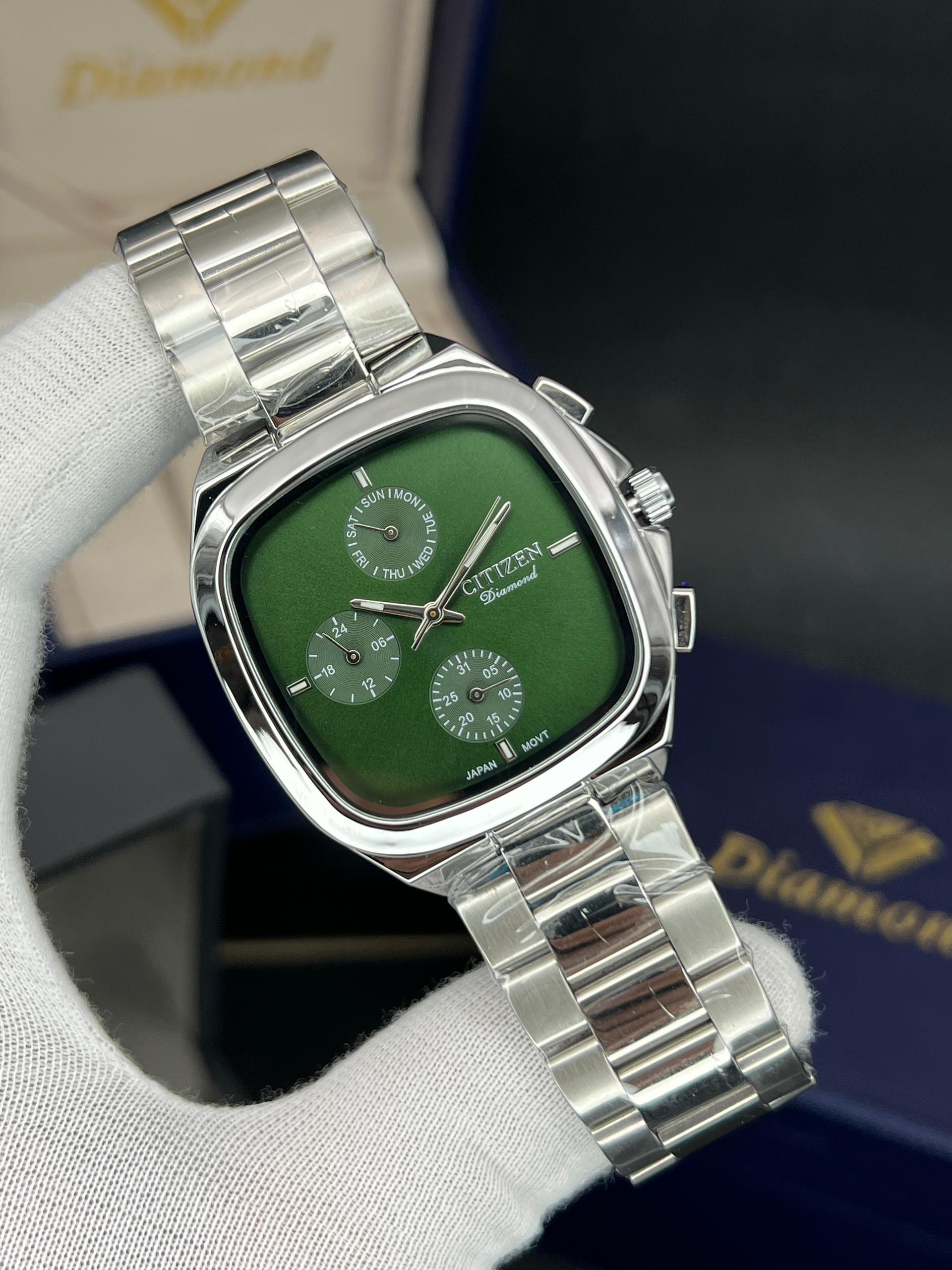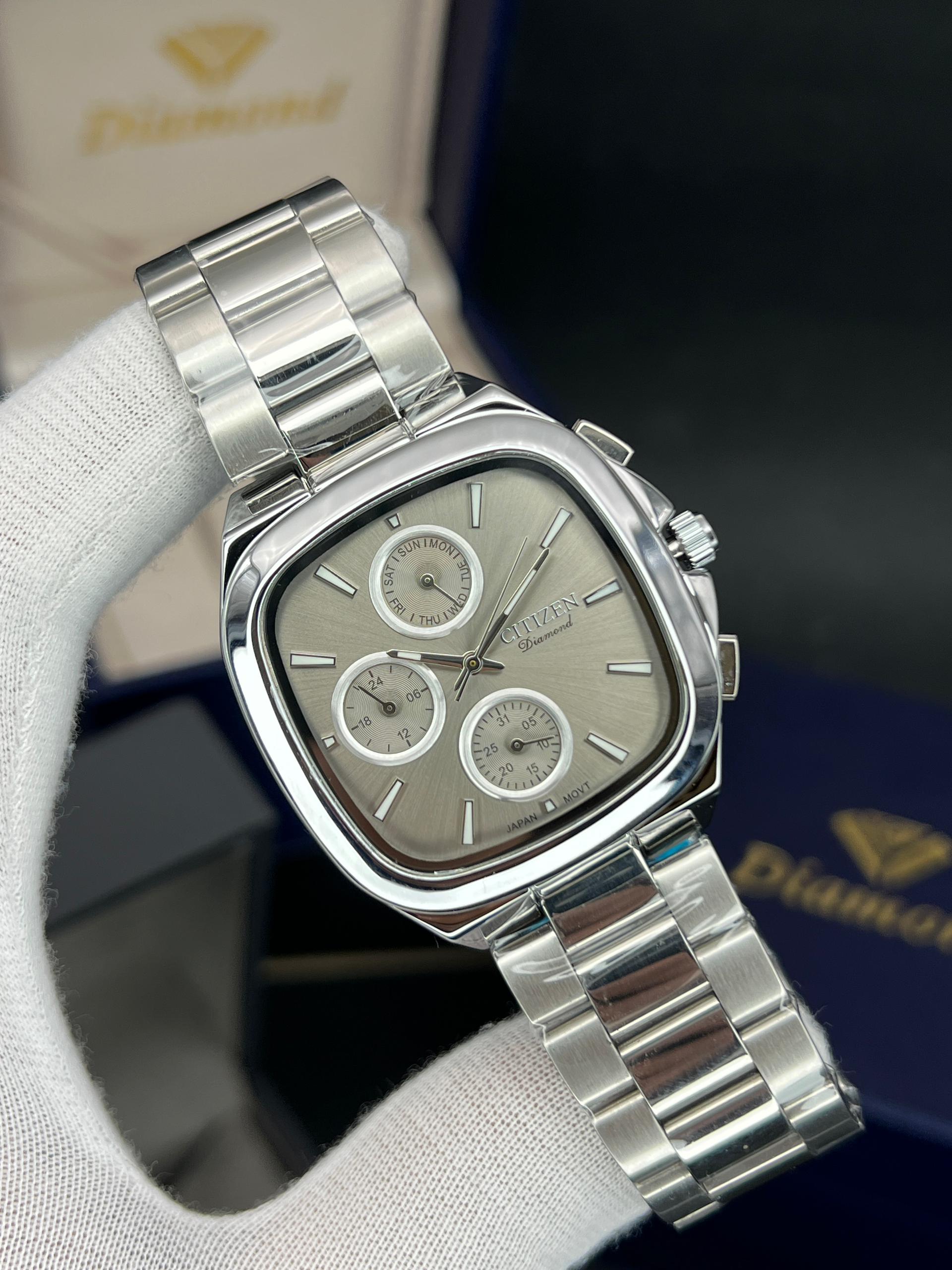 رومانسون مردانه سه موتوره فعال چهارگوش مدل خاص و پرفروش تنوع رنگ قاب و رنگ صفحه موتور ژاپن با گارانتی یکساله موتور ضد اب در حد دست شستن دارای تقویم روز وایام هفته