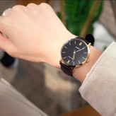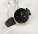 این ساعت با قاب گرد و ظریف استیل طلایی و صفحه مشکی با شاخصهای مینیمال، حس کلاسیک و مدرن را همزمان منتقل میکند. بند چرمی مشکی علاوه بر زیبایی، راحتی بالایی هنگام استفاده روزانه ایجاد میکند و ظاهر ساعت را برای محیطهای رسمی و روزمره مناسب میسازد.