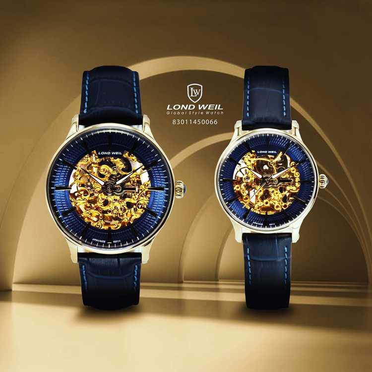 "Londweil" • Code: 83011450066 • [information] Mechanical Leather Strap Gold Case Dial & Strap Navy Blue Couple Watch • [مکانیکی بند چرمی قاب طلایی] [صفحه و بند سرمه ای ست] • •